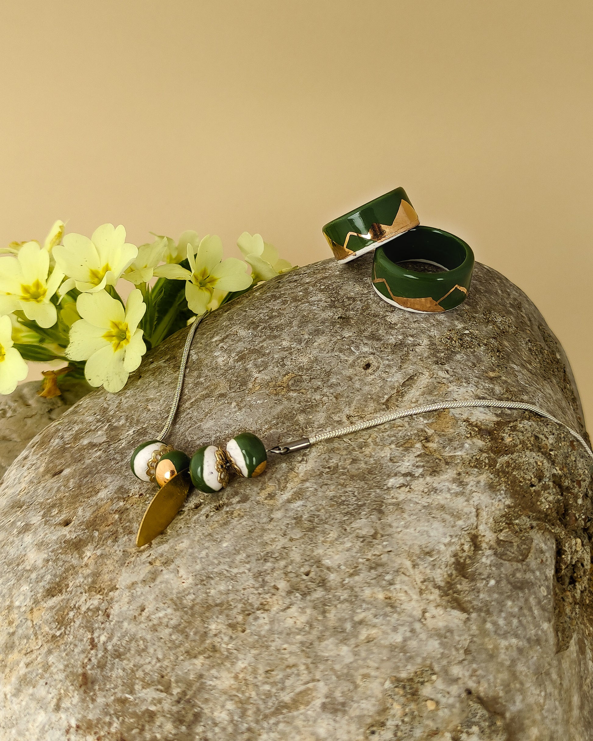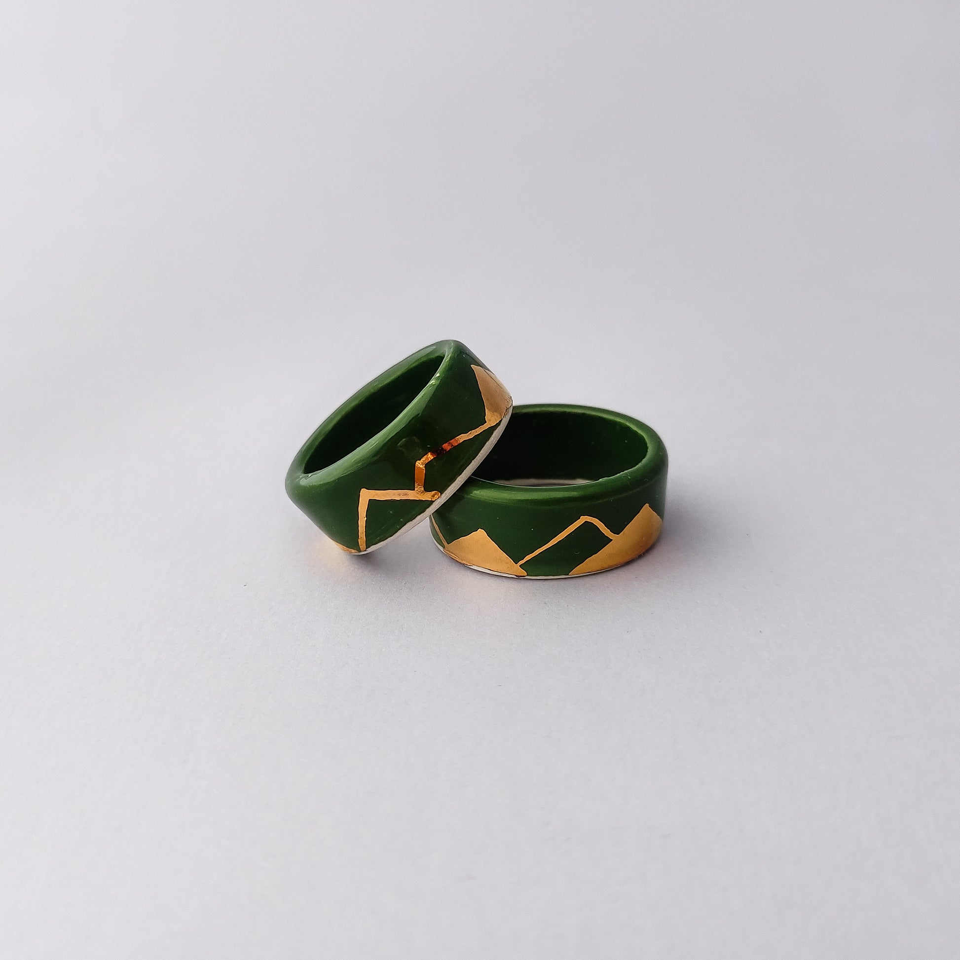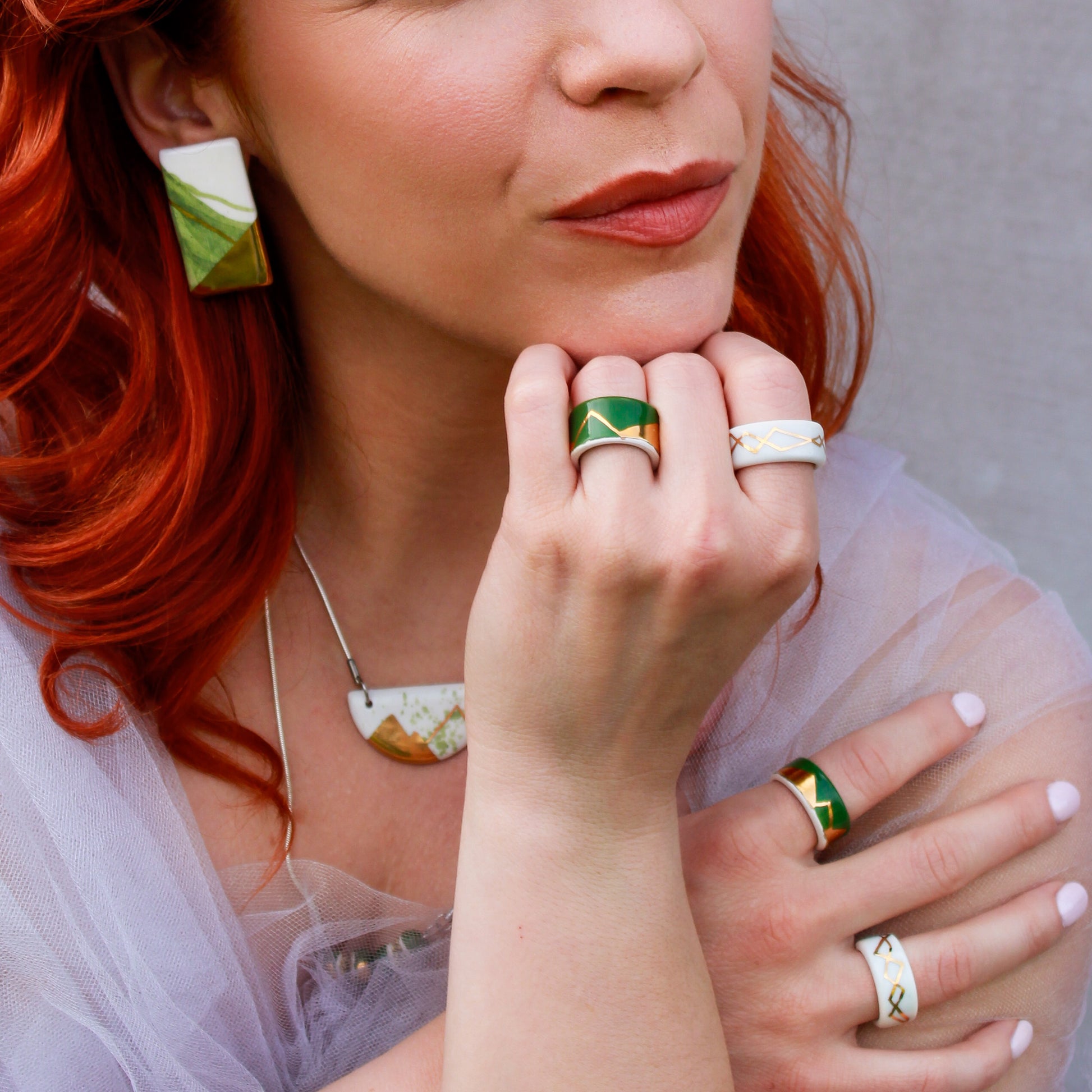 Nježni planinski vrhovi od porculana obavijeni su sjajnom pozlatom, stvarajući privlačan kontrast materijala. Bilo da se nose kao upečatljivi komad ili dnevni dodatak, ova umjetnička djela evociraju sjećanja na prekrasne vidike i avanture. Svaki je komad pažljivo ručno izrađen kako bi utjelovio surovost, ali spokoj ovih zadivljujućih prirodnih čuda.