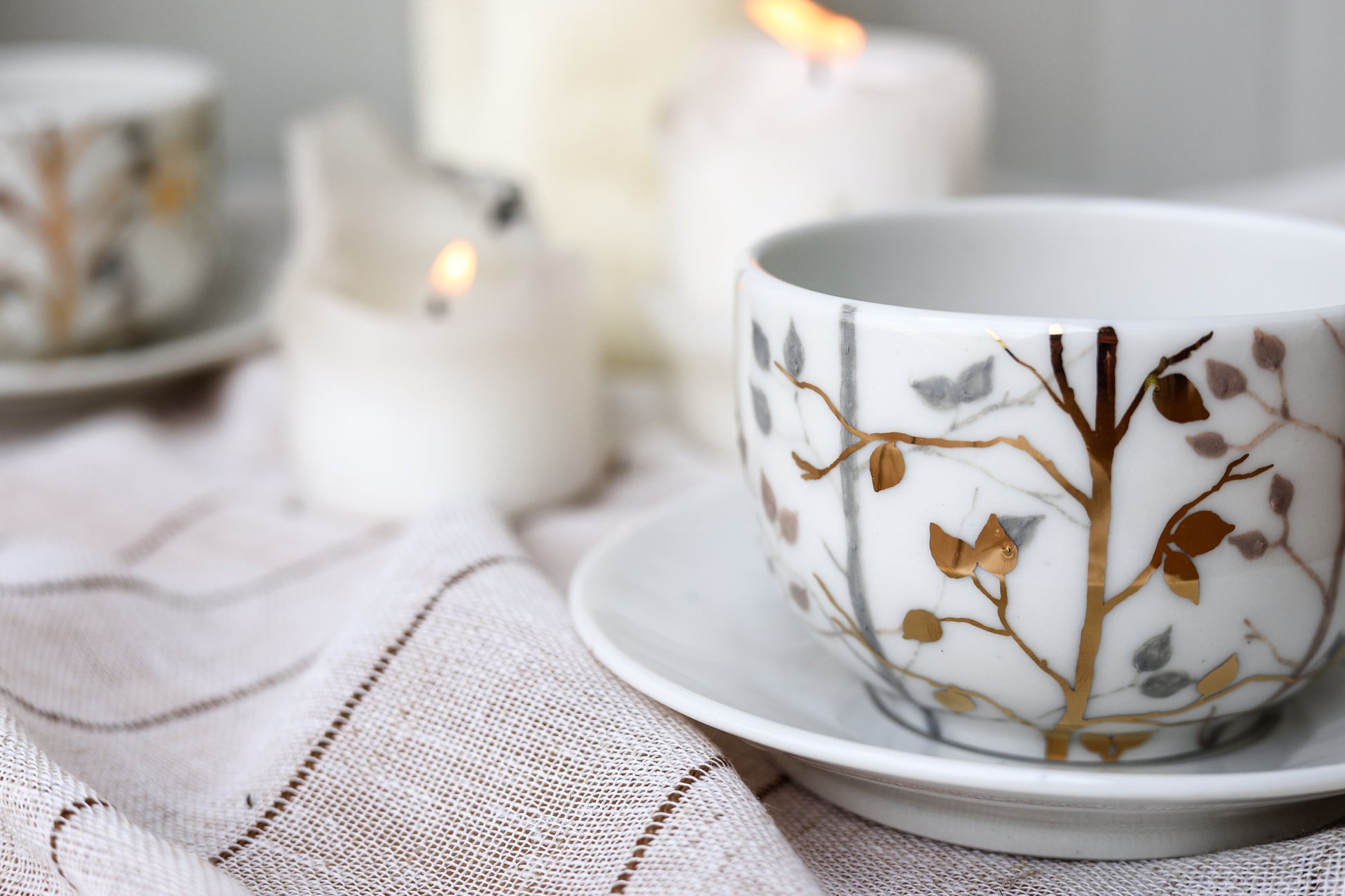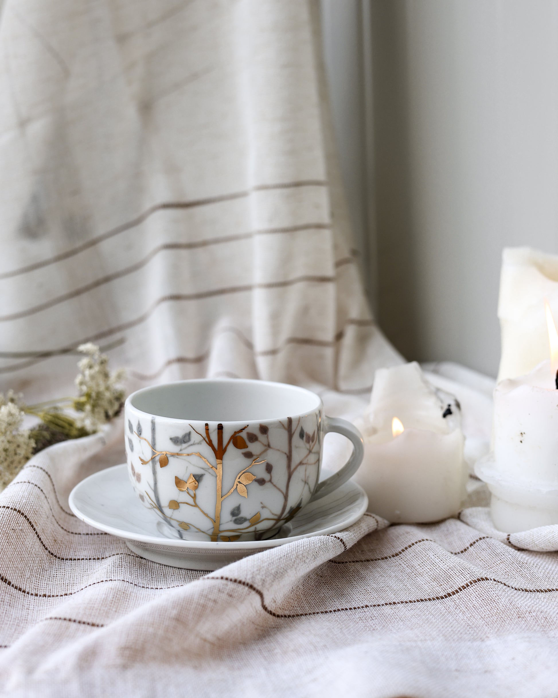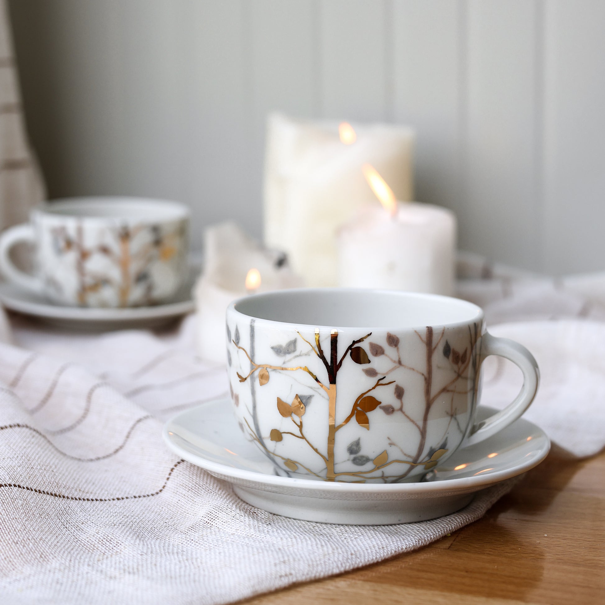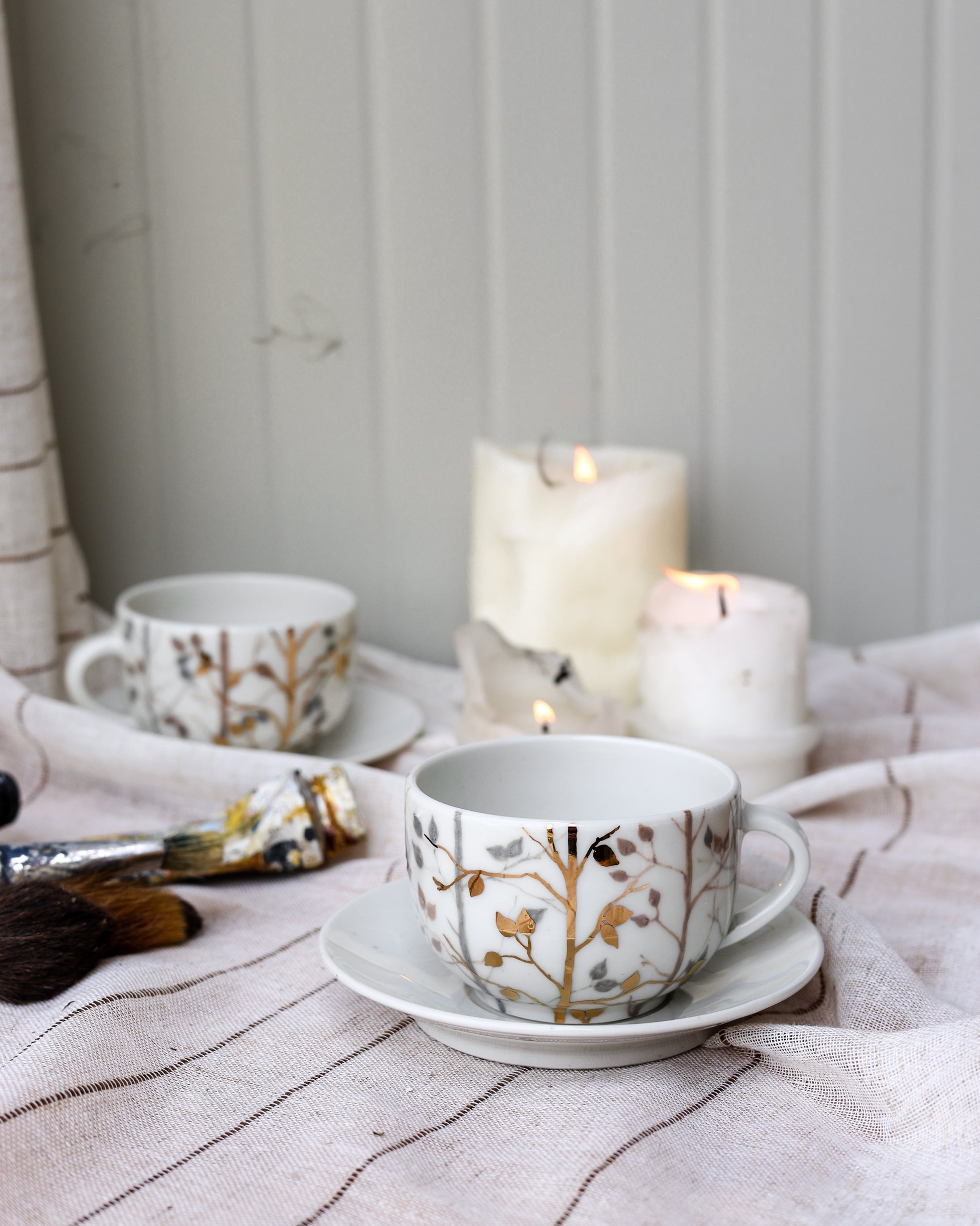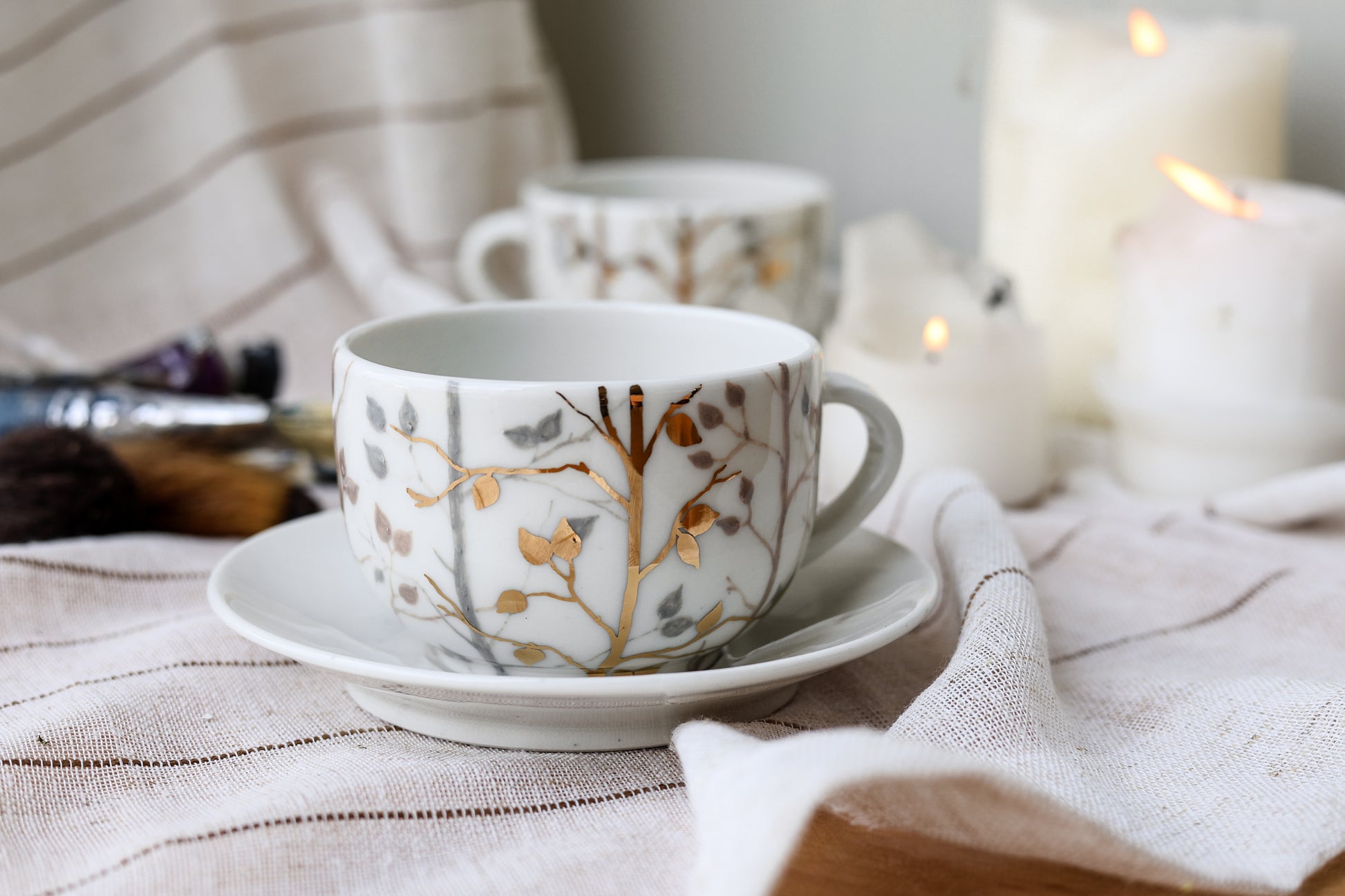 Porculanska cappuchino šoljica sa tanjrićem. Napravljena ručno na grnčarskom točku, oslikana ručno i dekorisana sa 24 karata pozlatom. Sigurna za svakodnevnu upotrebu i pogodna za mašinsko pranje na manjim temperaturama..