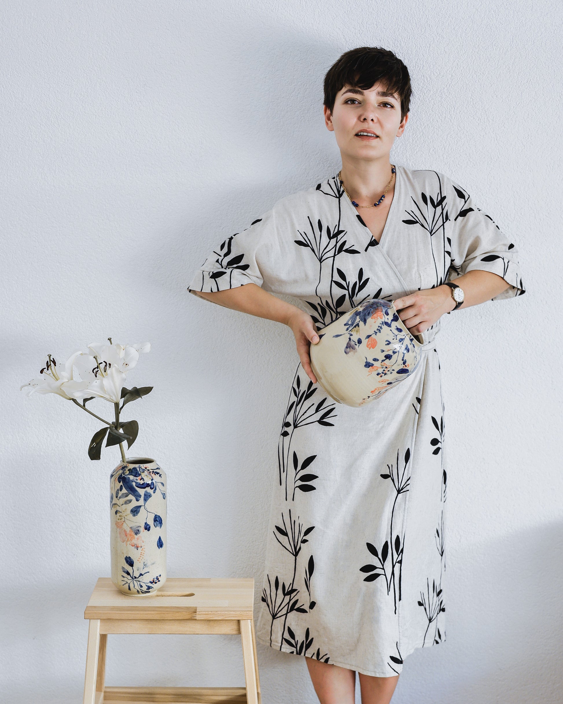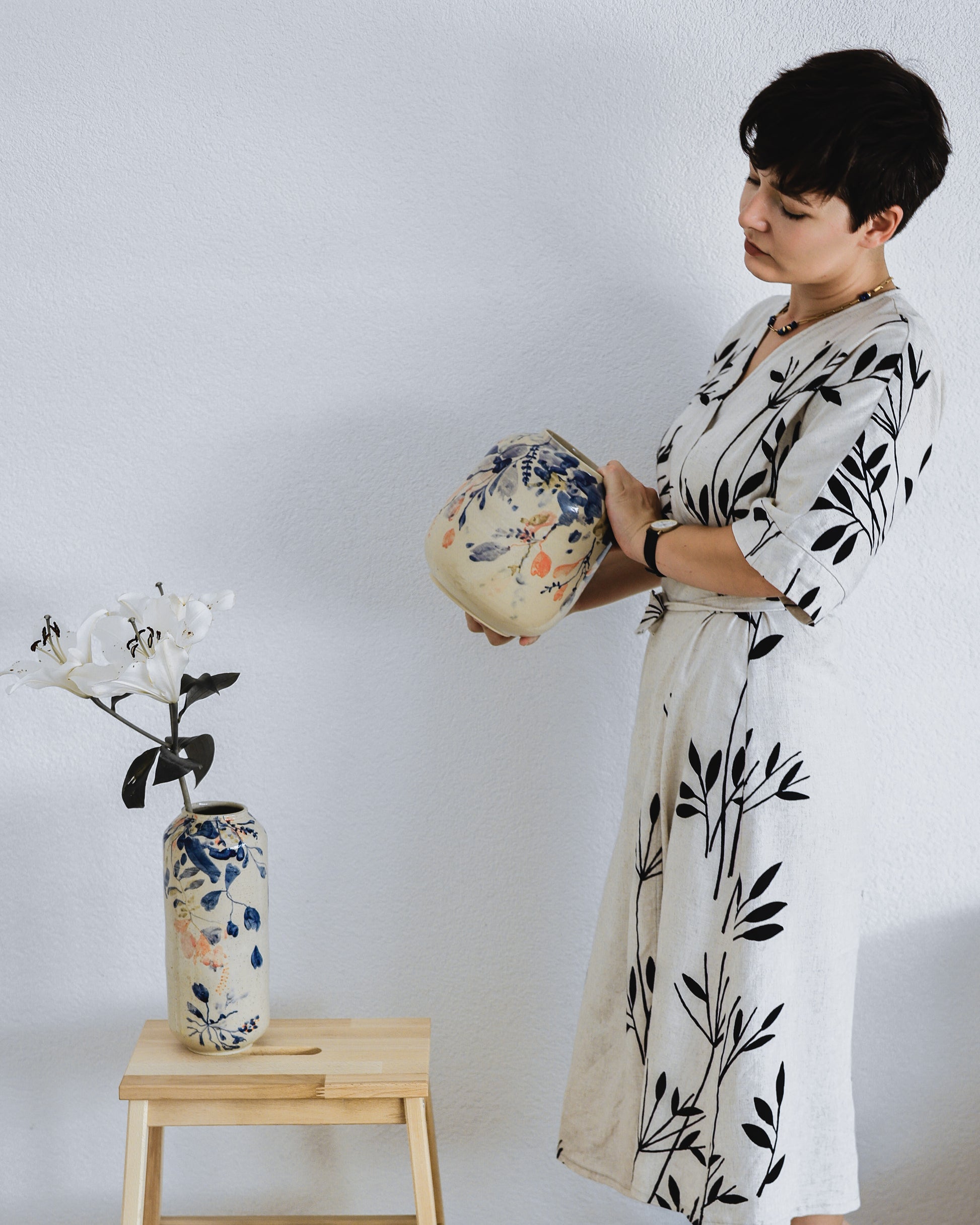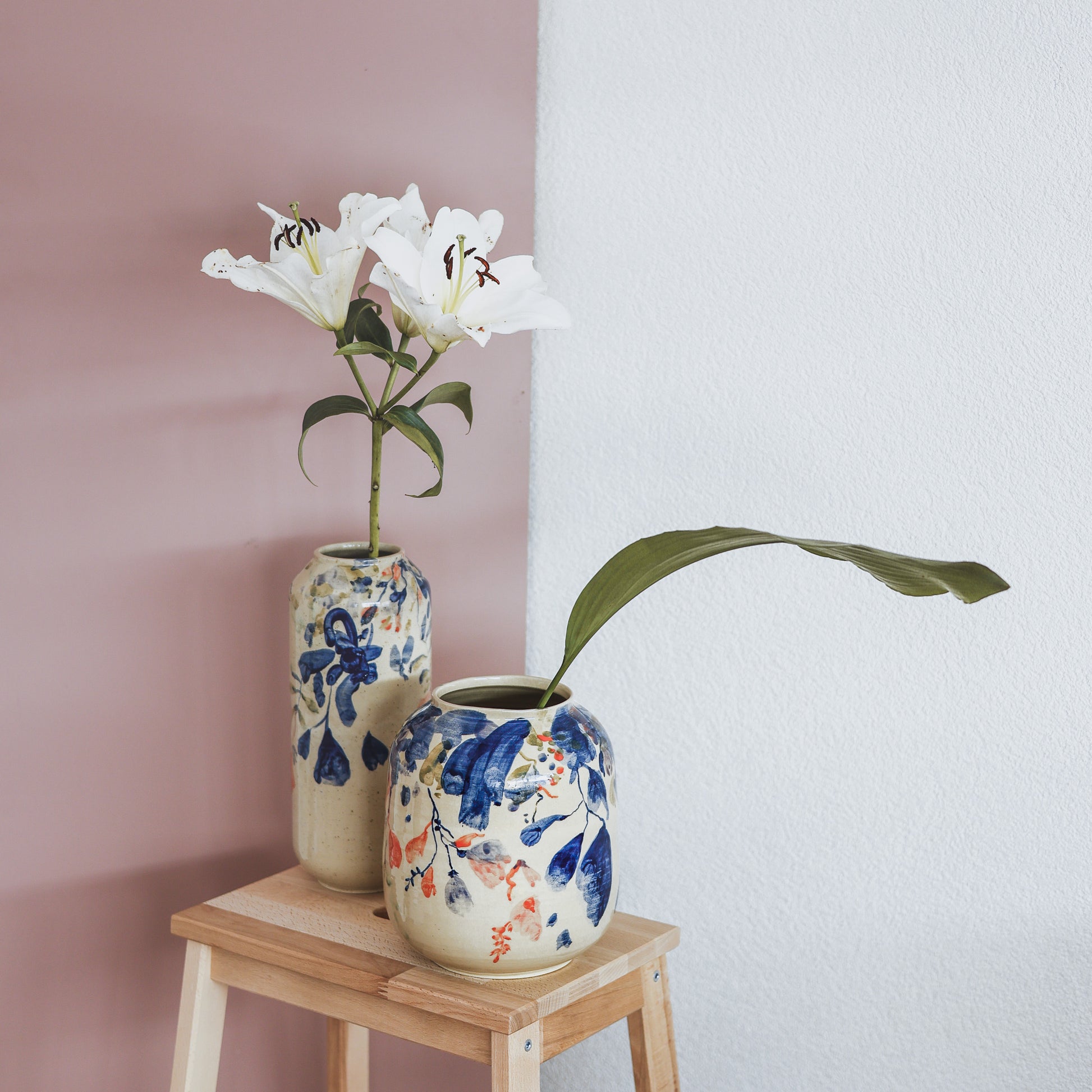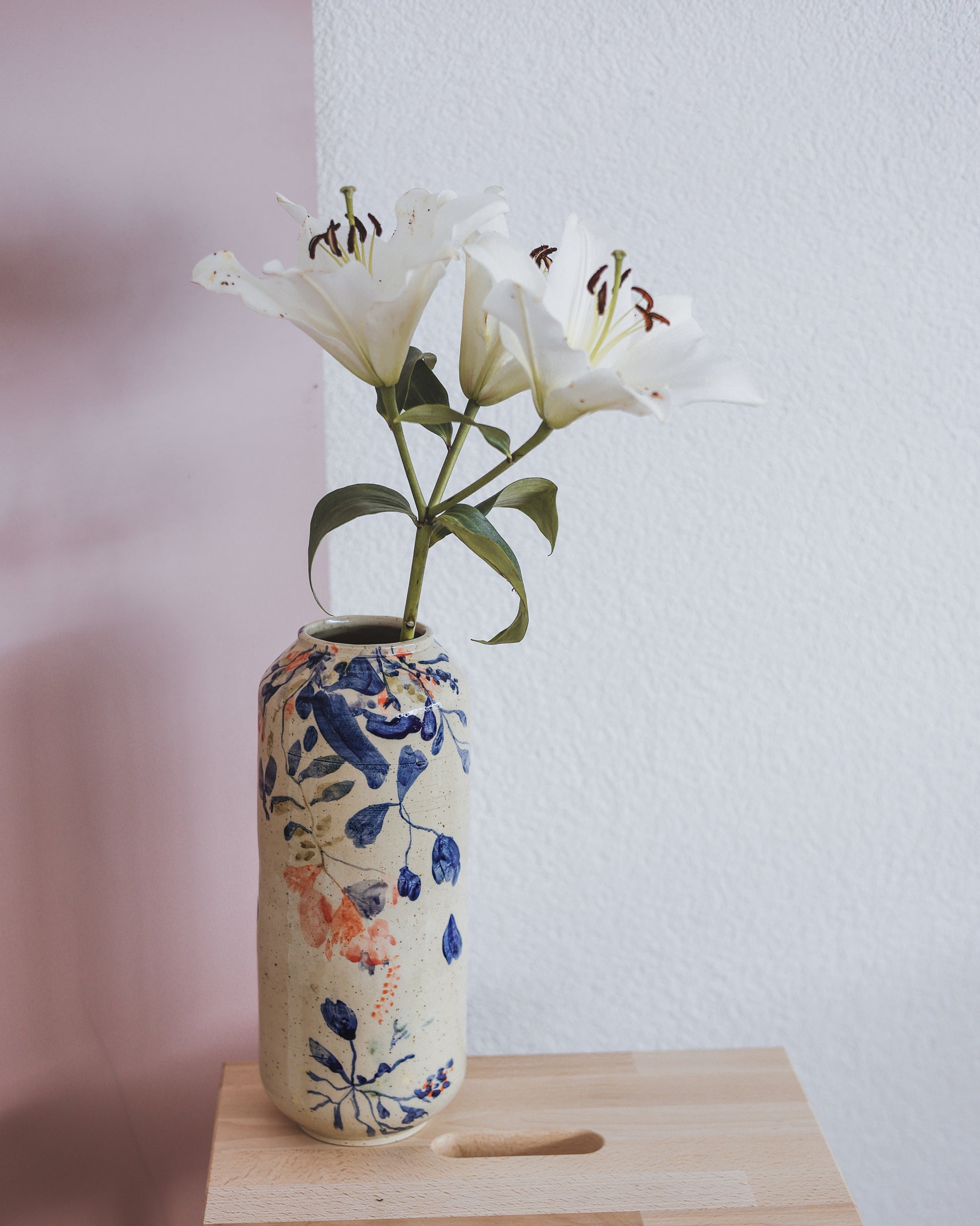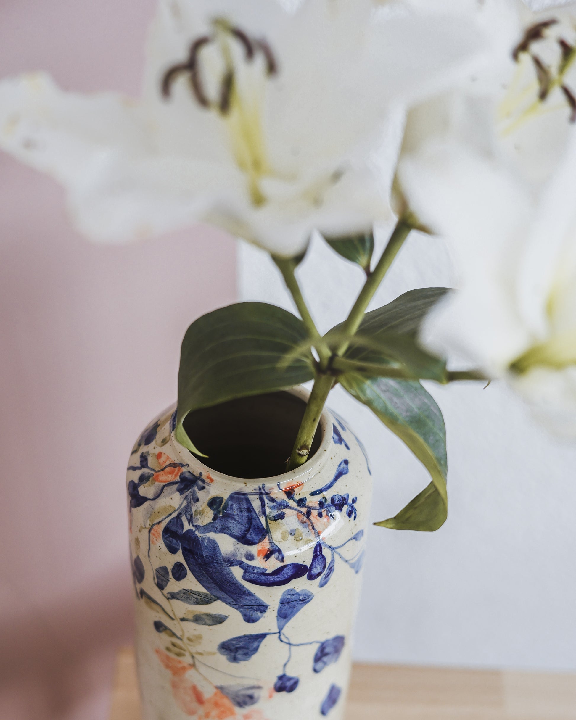 Glinena vaza rađena ručno na grnčarskom točku. Oslikana rukom. Sigurna za mašinsko pranje.
