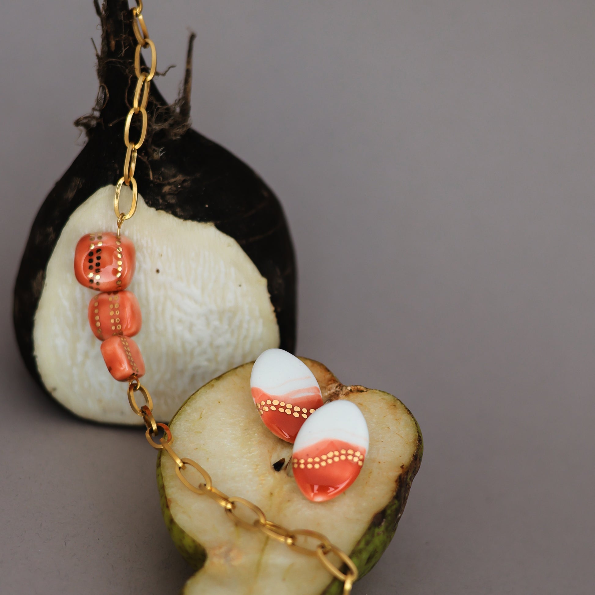 karatna pozlata dodaje dašak raskoši i sofisticiranosti nakitu, podižući ga na novi nivo luksuza. Paleta boja kolekcije odražava bogate nijanse i suptilne tonove pronađene na slikama mrtve prirode. Metalni dijelovi su napravljeni od hipoalergenog čelika.Ova fuzija umjetničkih formi stvara zadivljujući narativ koji slavi prolaznu ljepotu života, odajući počast prolaznosti postojanja.