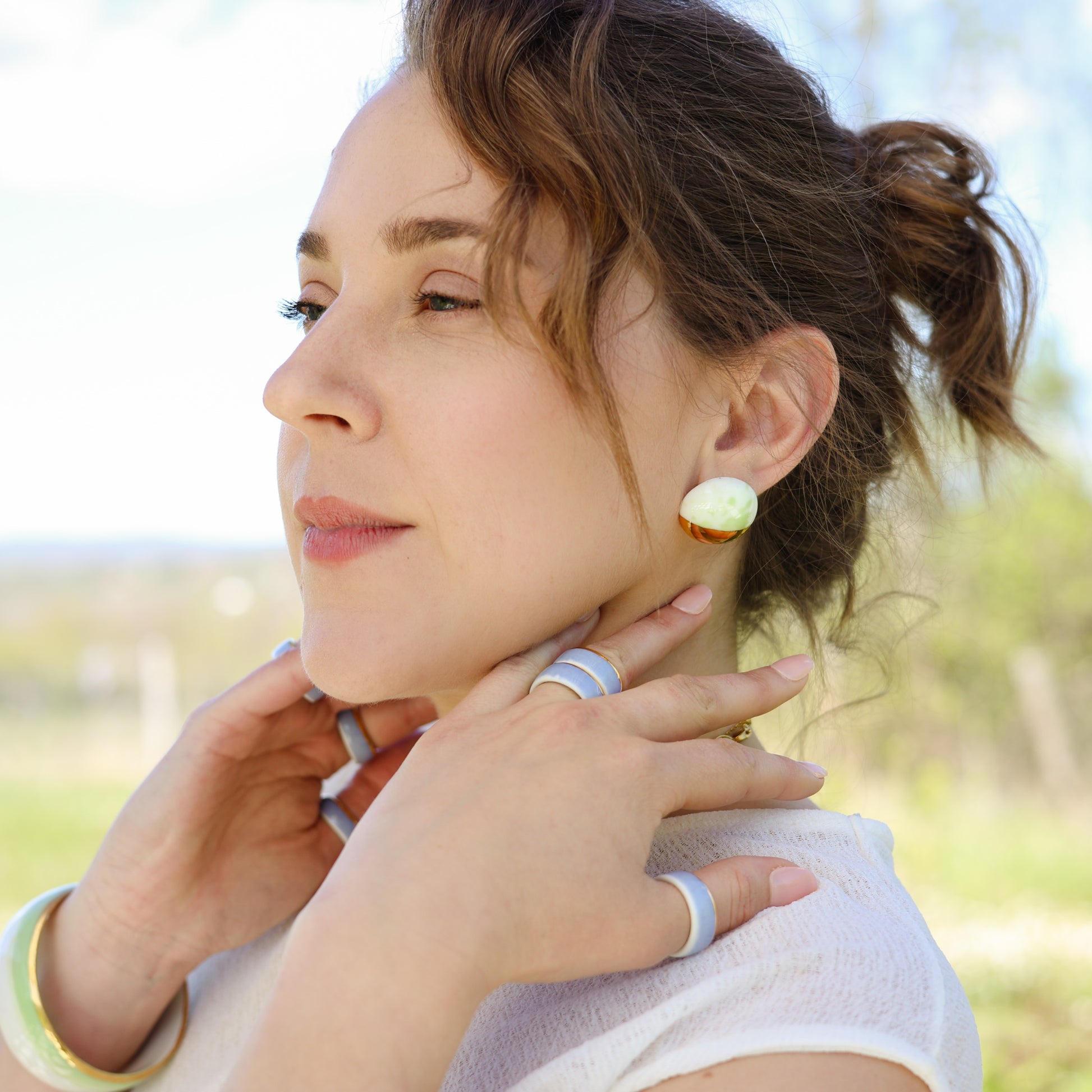 Nježne pastelne nijanse porculana evociraju suptilne tonove ranog svitanja, dok sunce izlazi i obasjava svijet mekim, zlatnim svjetlom. Porculanske elemente pažljivo upotpunjuje pozlate i hipoalergeni nehrdjajući čelik; dodajući im luksuzan sjaj. Toplina sjaja zlata kontrastira sa porcelanom, stvarajući zapanjujuću igru svetla i senki koja hvata suštinu prolećnog jutra.