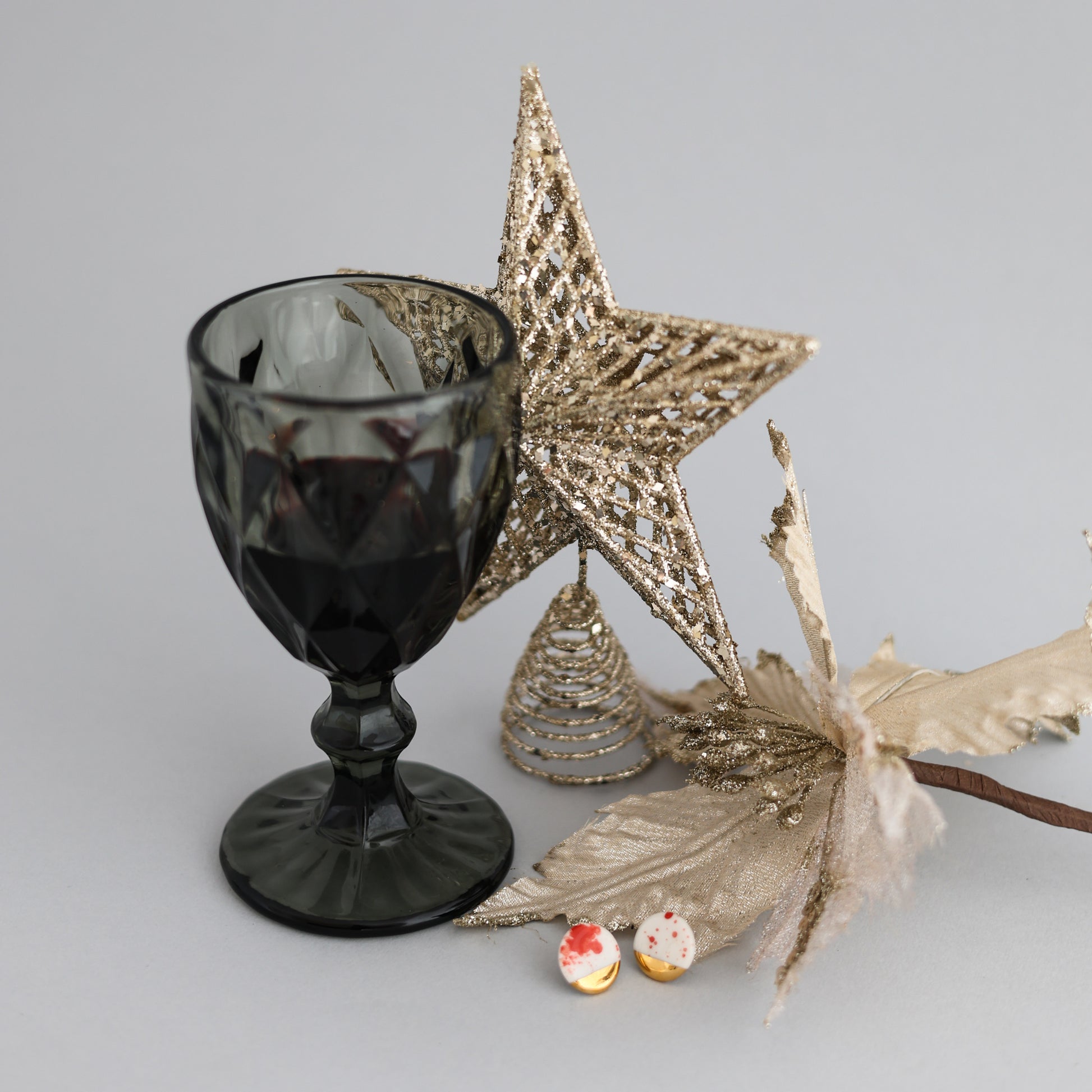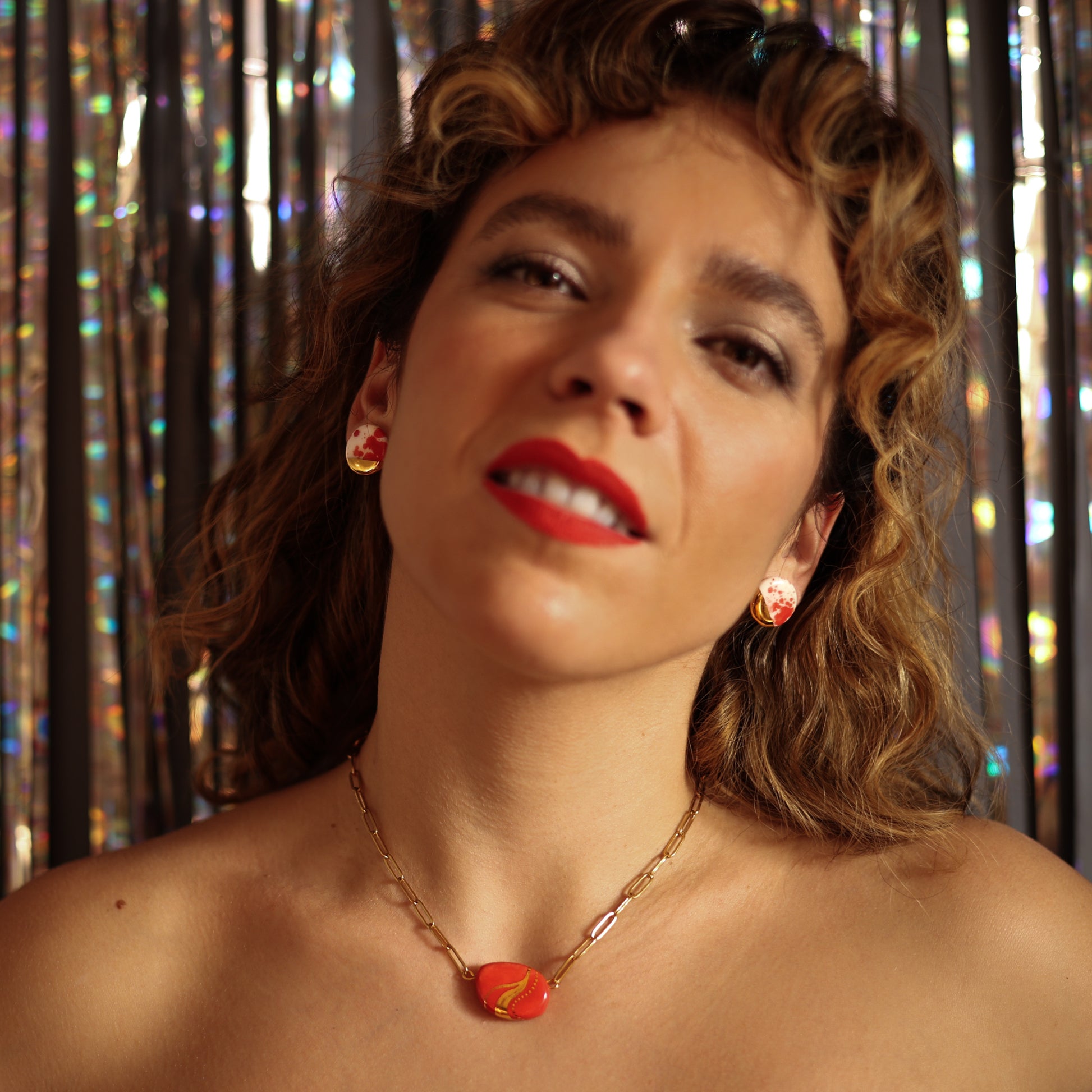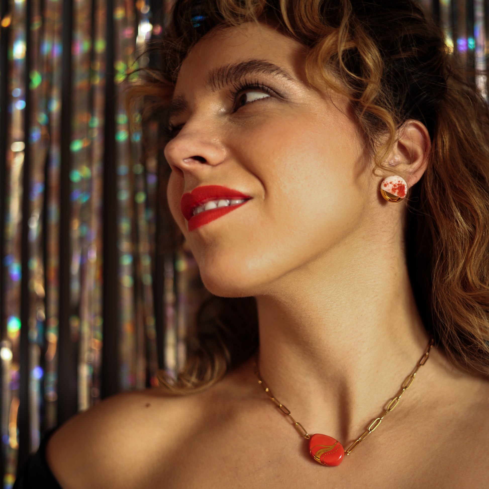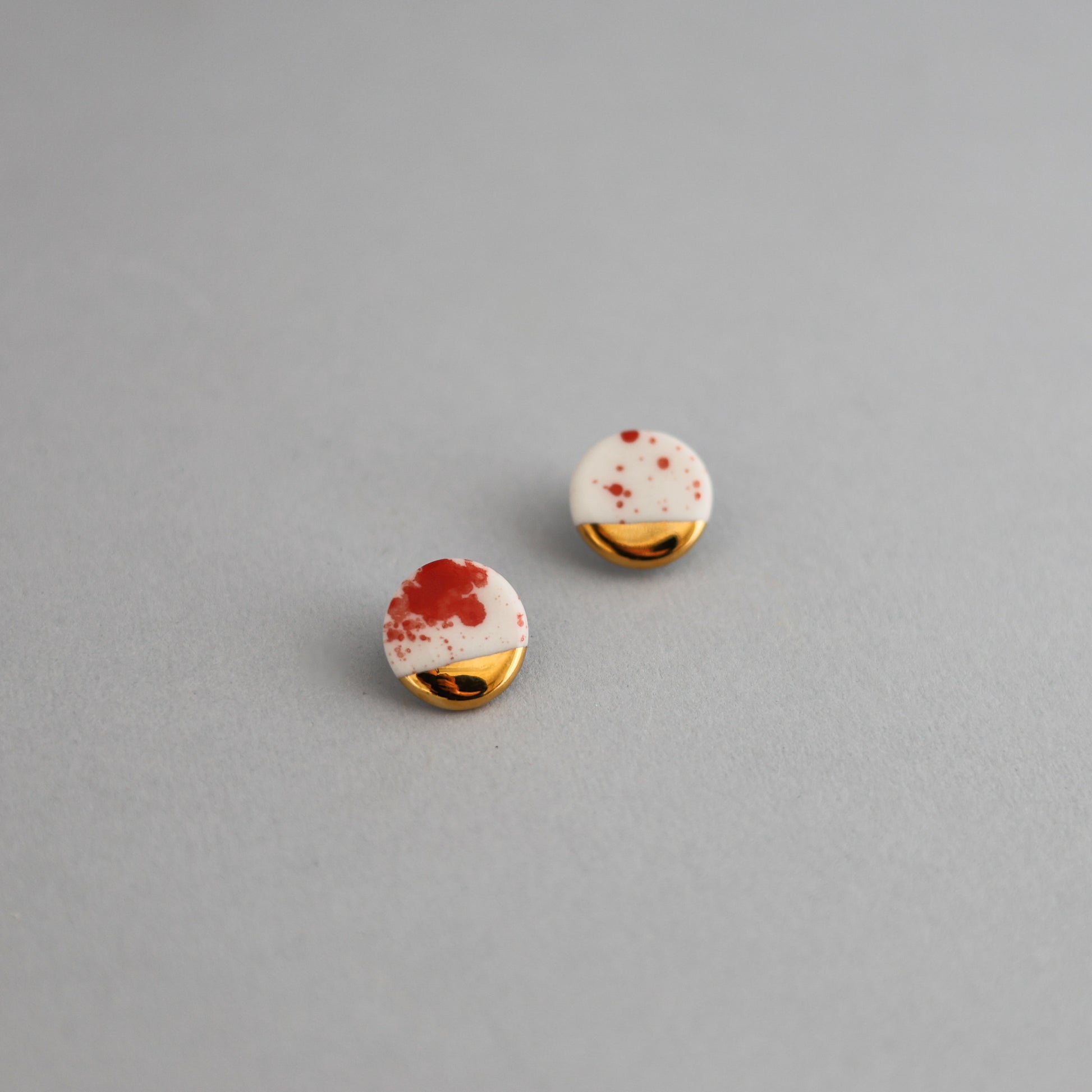 Glatka, sjajna završna obrada naušnica od porculana savršeno nadopunjuje bogat, topao ton 24 karatne pozlate. Metalni dijelovi su napravljeni od hipoalergenog čelika.